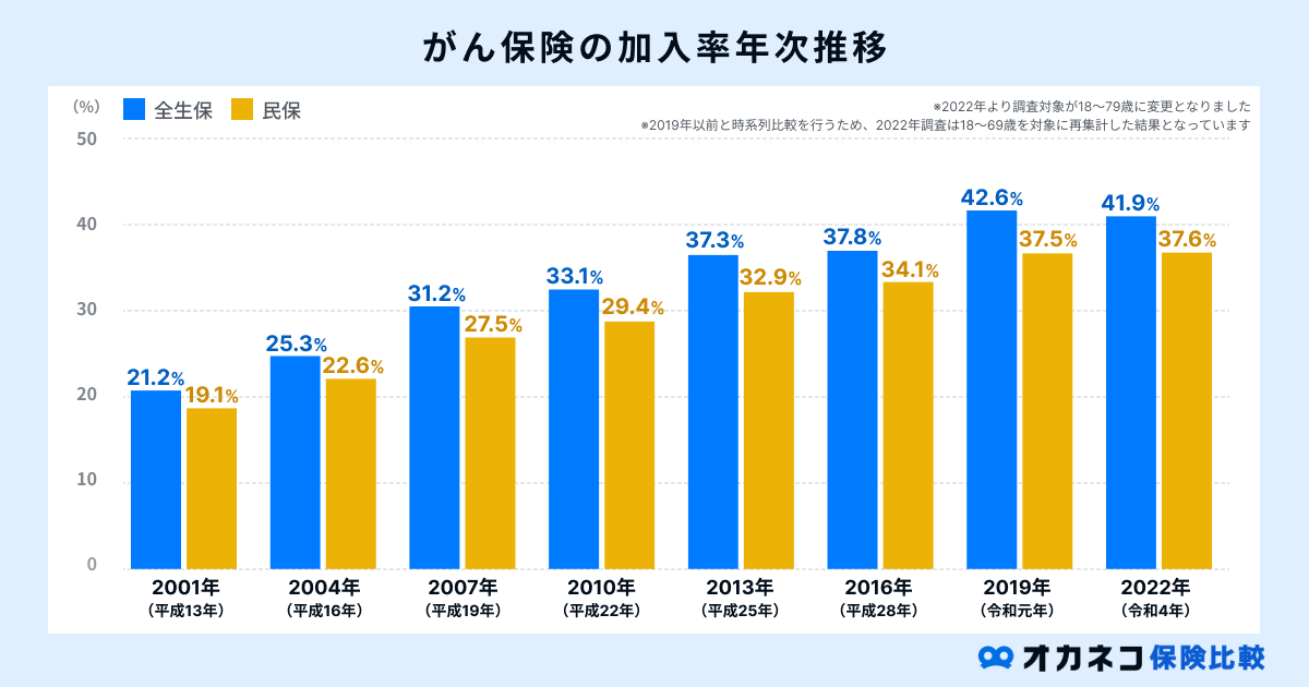 生命保険文化センターの「生活保障に関する調査」では、全国の18〜79歳を対象とした個人調査が行われており、その中でがん保険・がん特約の加入率が公開されています。