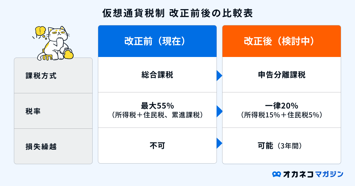 現在は最大で55%の税金がかかる「総合課税」ですが、将来的には株式投資と同じ一律20%(所得税15%+住民税5%)の「申告分離課税」に変更される予定です。