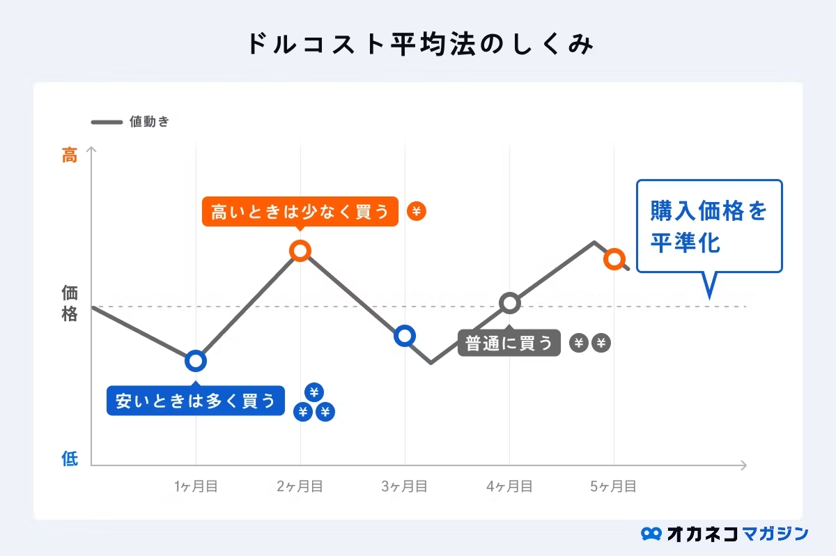 積立を利用すると「ドルコスト平均法」により投資対象の価格が高いときには少なく、安いときには多く購入できて購入単価が平準化されるため、リスクを抑えて運用できます。
