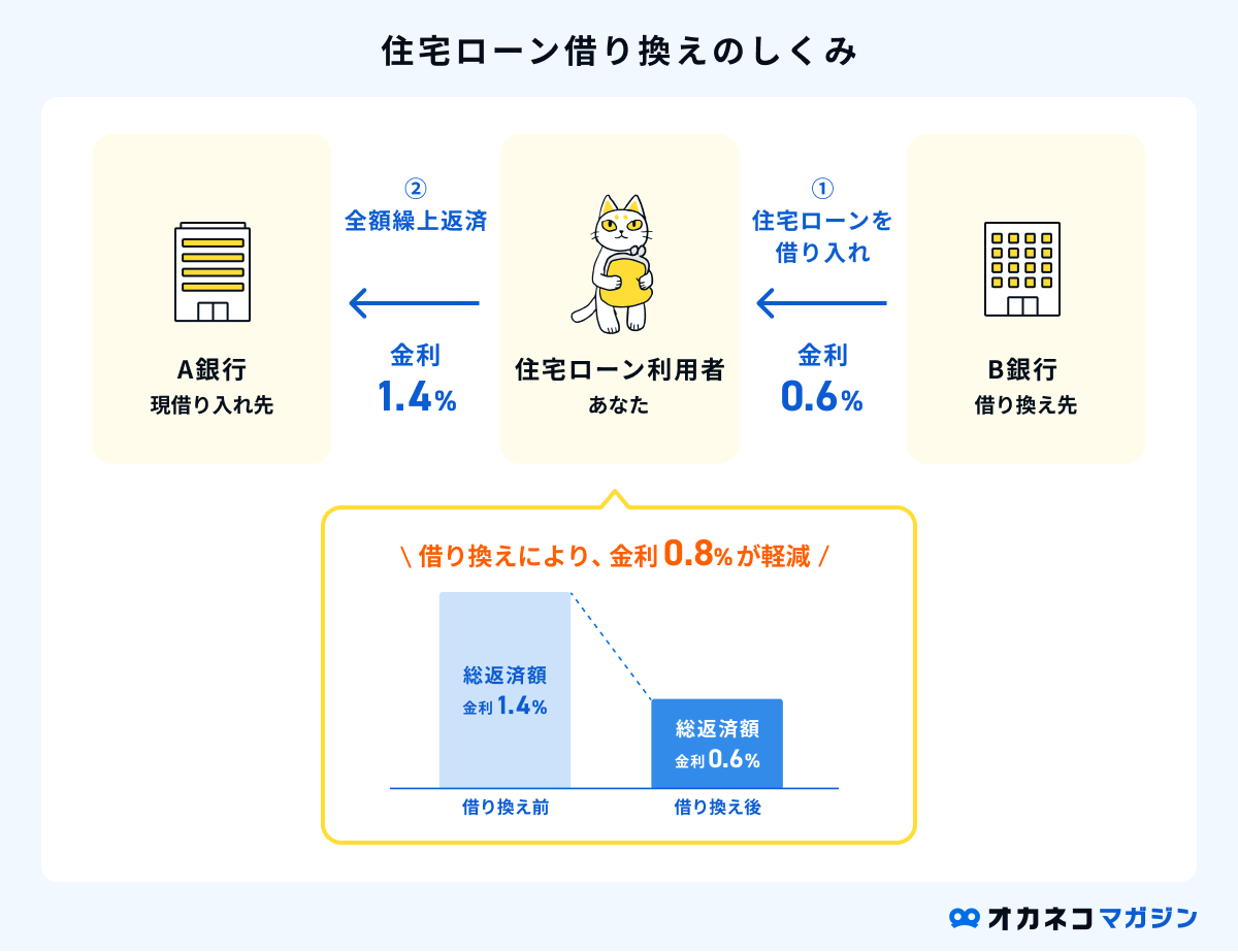 例えば、低金利の住宅ローンに借り換えることで毎月の返済額が軽減できたり返済期間を短縮できる場合もあり、これにより支払う利息の総額が減らせます。