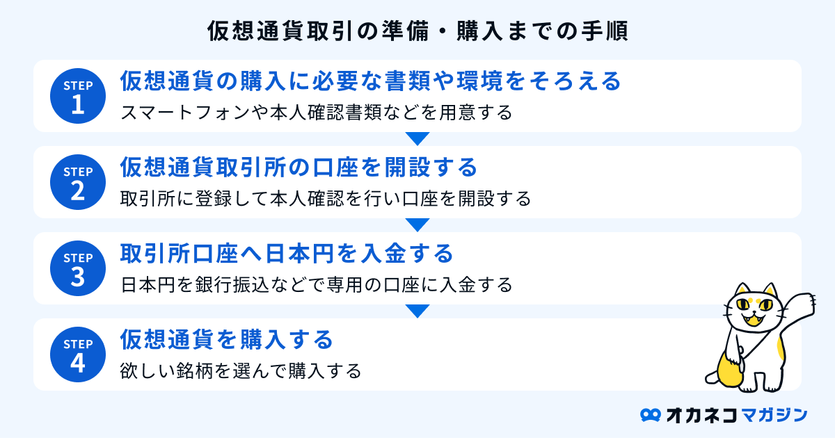 仮想通貨への投資は、大きく分けて以下の4つの手順で始められます。