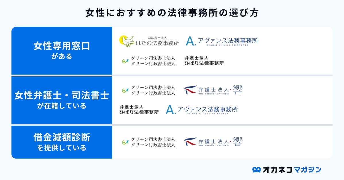 - 女性専用窓口を設け、女性でも安心して相談できる