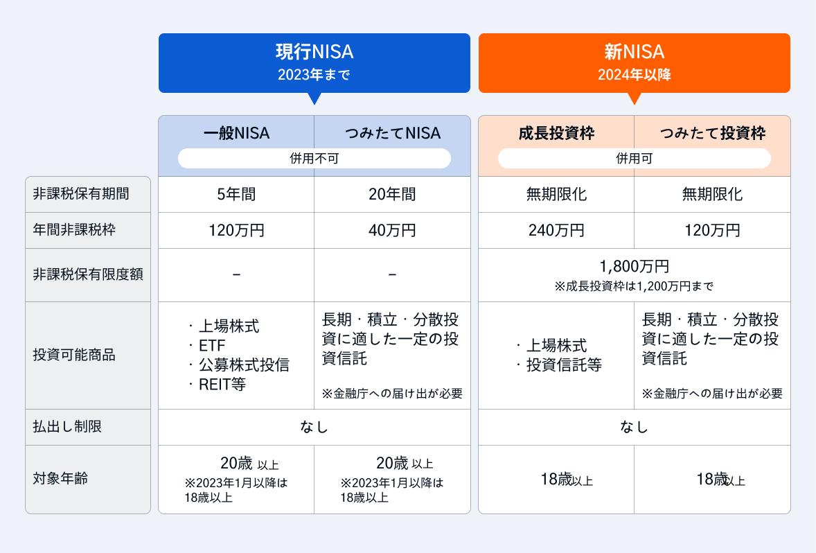 なお、2023年までのNISA・つみたてNISAの買付・積立投資は2023年で終了となりましたが、2024年以降の新NISA制度とは別枠で非課税保有枠が継続されます。