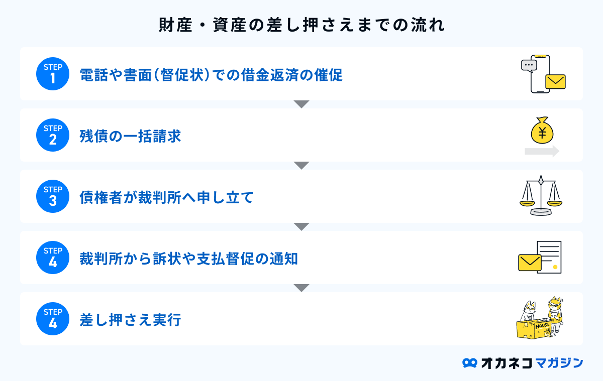 借金地獄になって返済が滞ると、最悪の場合は財産・資産を差し押さえられることになります。ただし、借金を滞納したからといって、ただちに差し押さえが実行されるわけではありません。
