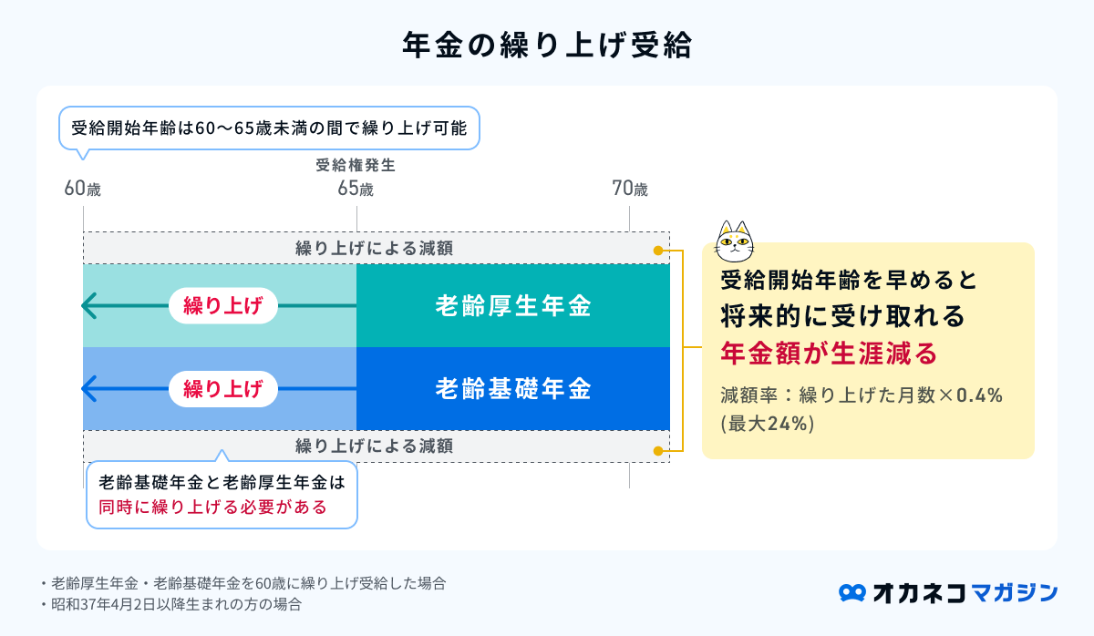 - 60〜65歳未満に受取開始「繰り上げ受給」:受給額は減少する