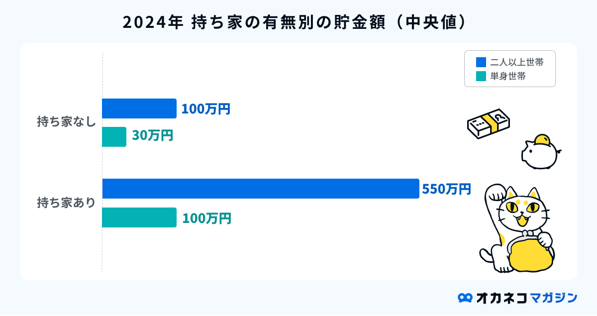 現在の貯金額と比較し貯金額が平均よりも多ければ、持ち家の購入時にかかる費用や固定資産税の支払い等に備えられ、また頭金を用意することで月々の返済額も抑えられるため、住宅を購入した方がメリットが高い可能性があります。