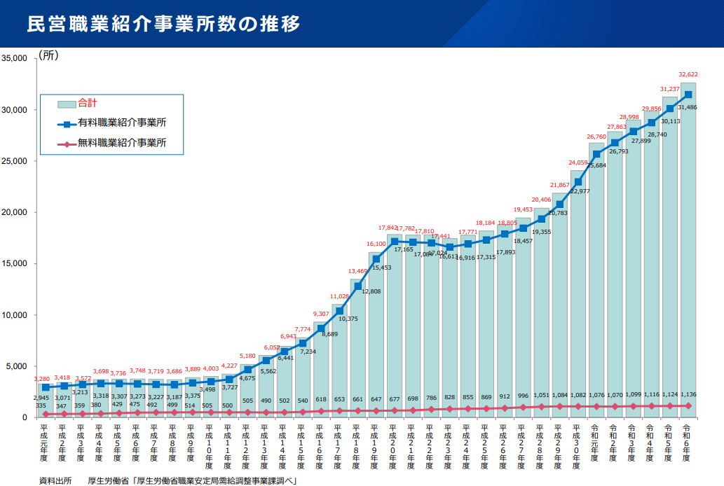 厚生労働省の情報によると、転職エージェントを含む民営職業紹介事業所数の推移は以下のとおりです。