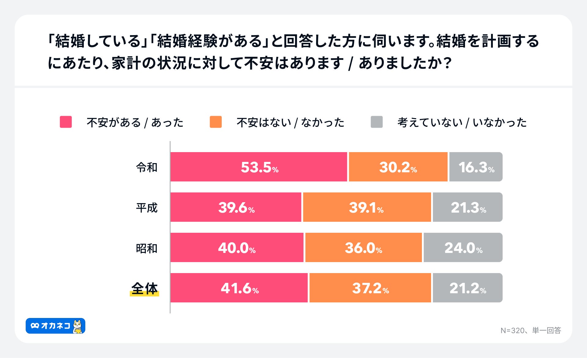- 家計の不安:41.6%が不安。令和婚夫婦が最も高く、過半数が家計に不安