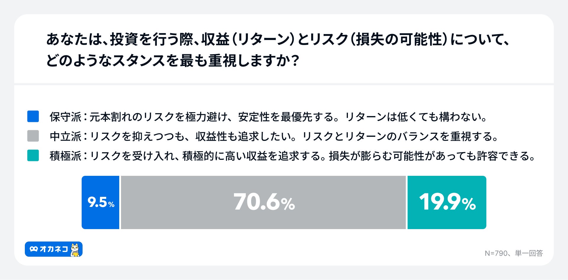投資スタンスは、「中立派」(リスクとリターンのバランスを重視)が70.6% と大多数を占めました。