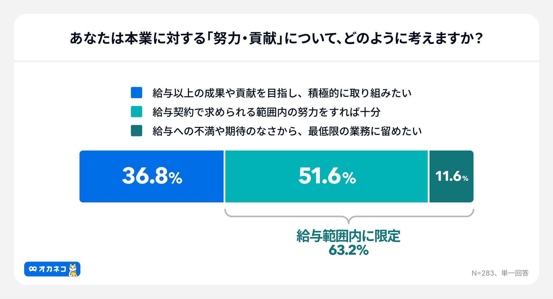 「給与への不満や期待のなさから、最低限の業務に留めたい」とする層11.6%と合わせ、努力や貢献を「給与範囲内」に限定する層は合計63.2%となり、「給与以上の成果を目指す」層は36.8%に留まる結果となったことから、働く個人の間でドライな「契約通り」の働き方が主流になっていることが示されました。