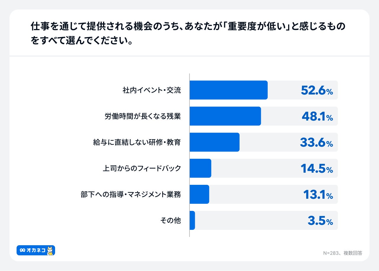 また、「仕事を通じて提供される機会のうち、あなたが「重要度が低い」と感じるものをすべて選んでください。」という問いに対し、「社内イベント・交流」52.6%、「労働時間が長くなる残業」48.1%が、それぞれ約半数に選ばれる結果となりました。