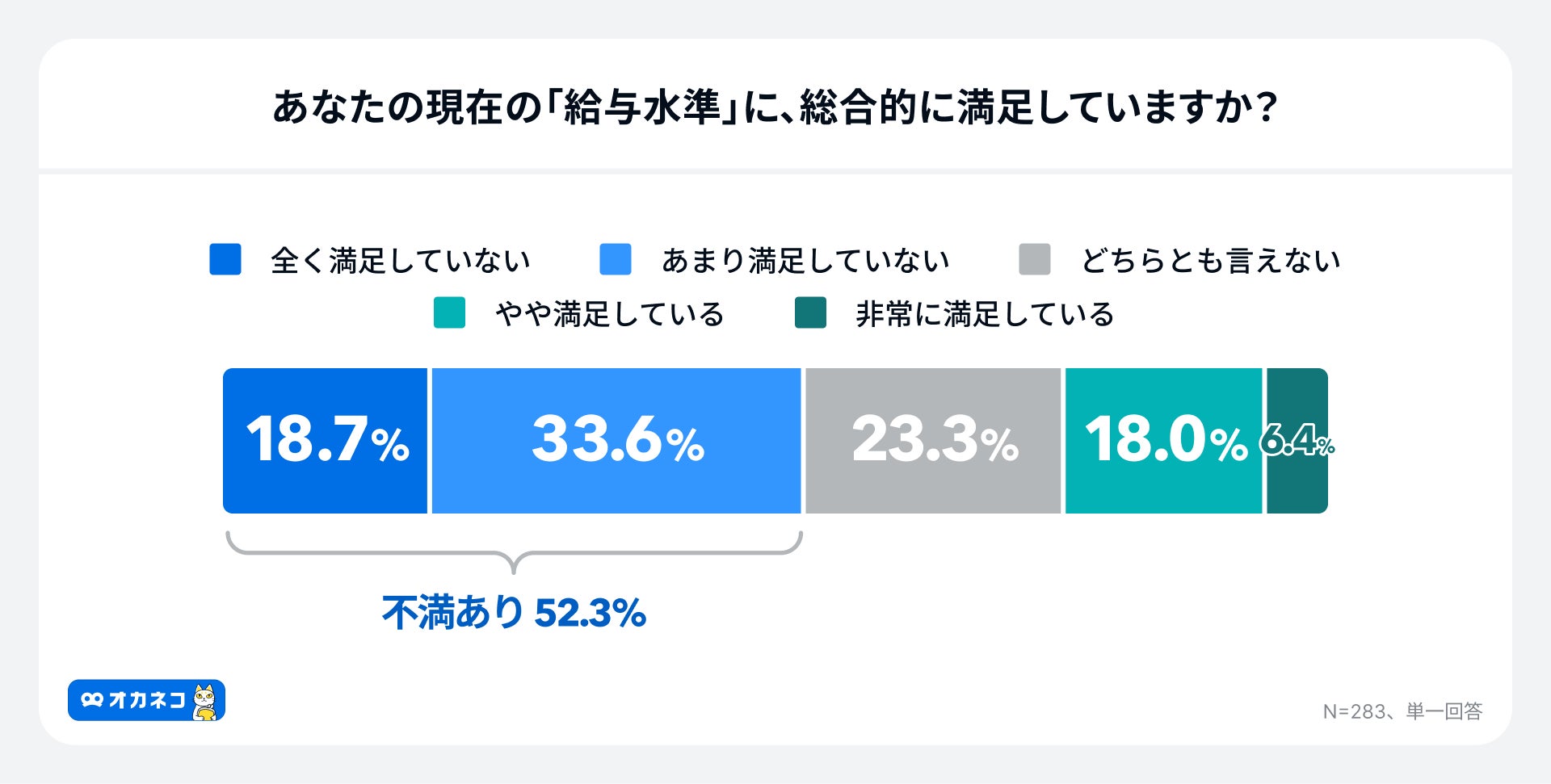 「あなたの現在の「給与水準」に、総合的に満足していますか」という問いに対し、「給与水準に不満あり」が52.3%(「全く満足していない」18.7%・「あまり満足していない」33.6%)と過半数に達している結果となりました。