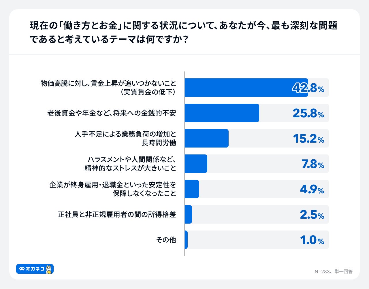 - 働く人が今最も深刻な問題と思うもの1位「実質賃金の低下」42.8%