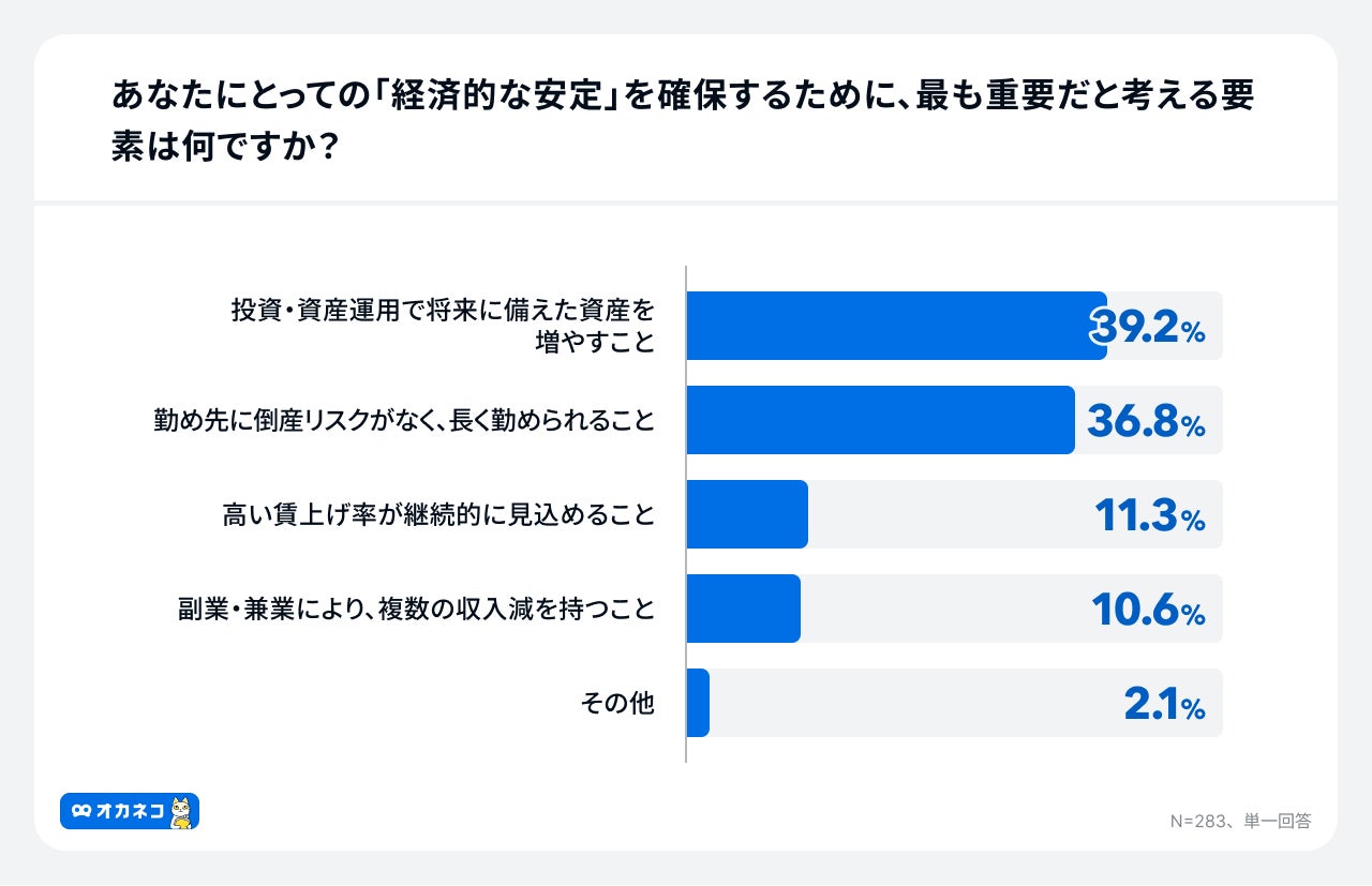 「あなたにとっての「経済的な安定」を確保するために、最も重要だと考える要素は何ですか?」という問いに対し最も多かった回答は、「投資・資産運用で将来に備えた資産を増やすこと」39.2%となりました。