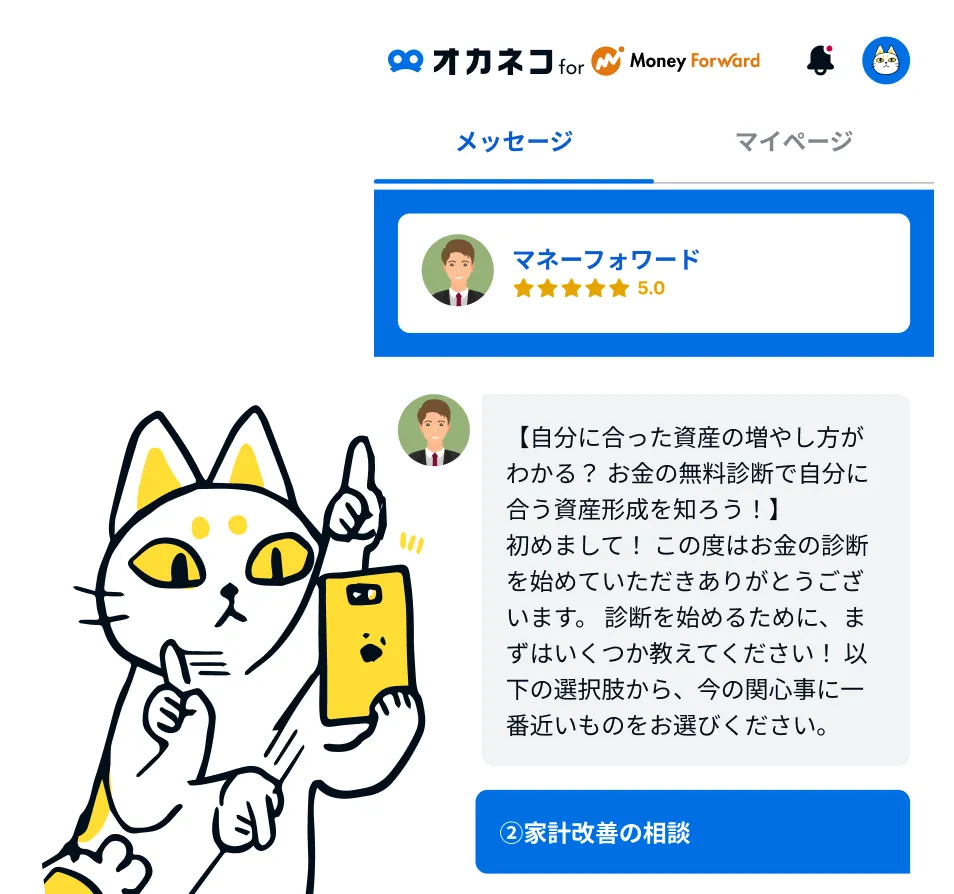 「オカネコ for MoneyForward」では、お金に関するかんたんな質問に答えるだけで