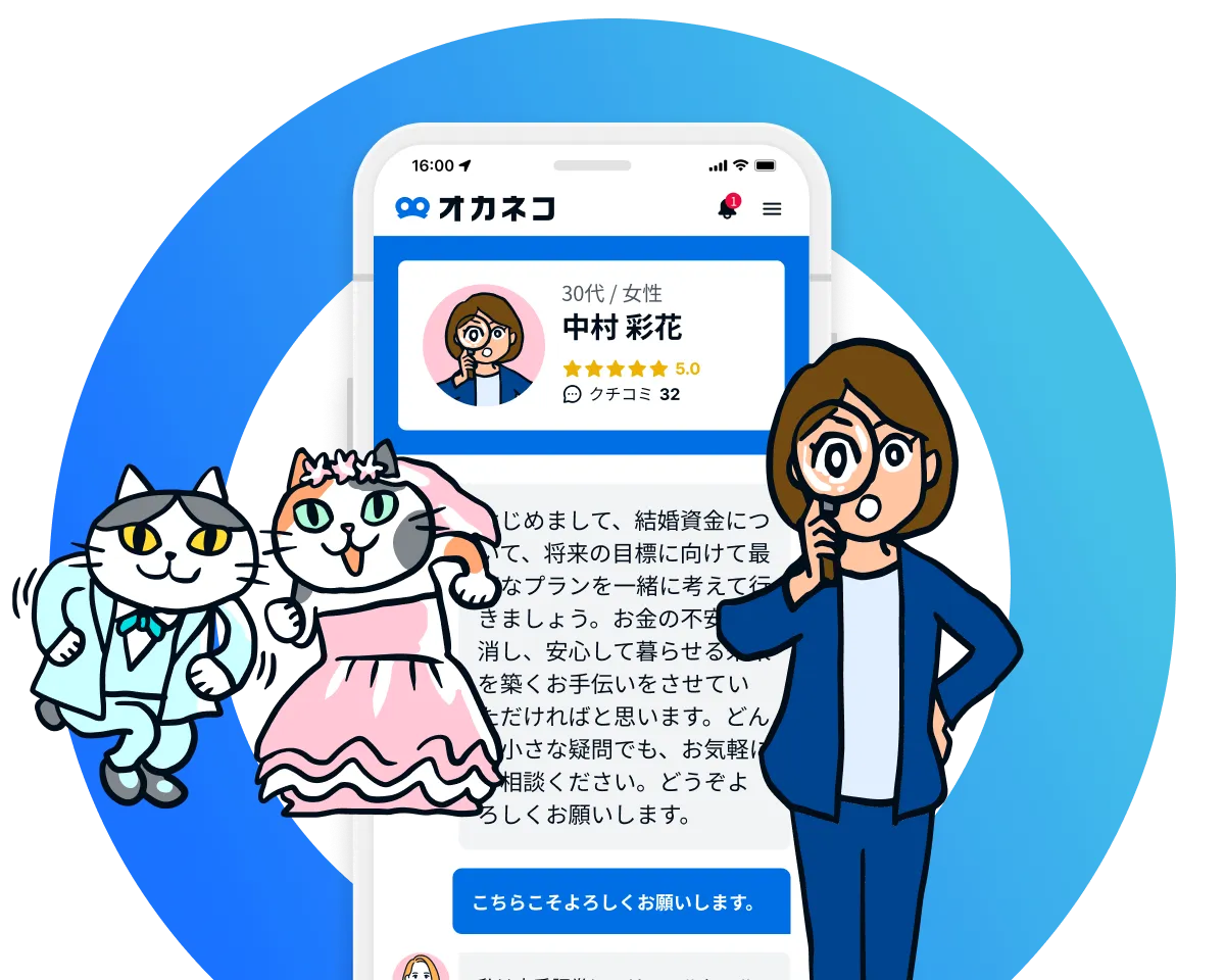 オカネコは複数の金融機関と提携しており、一般的な金融サービスとは異なり、結婚資金を含む幅広い資産形成の選択肢を提供できます。その中からあなたに本当に必要な結婚資金プランを提案し、特定の会社に偏らない中立的な視点でのアドバイスを行います。無理に商品を押し売りせず、理想の暮らしや考えを踏まえたオリジナルの提案を行います。さらに、資産運用や住宅関連に詳しい経験豊富なFPが幅広い選択肢から対策を提案し、安心してご相談いただける環境を提供します。