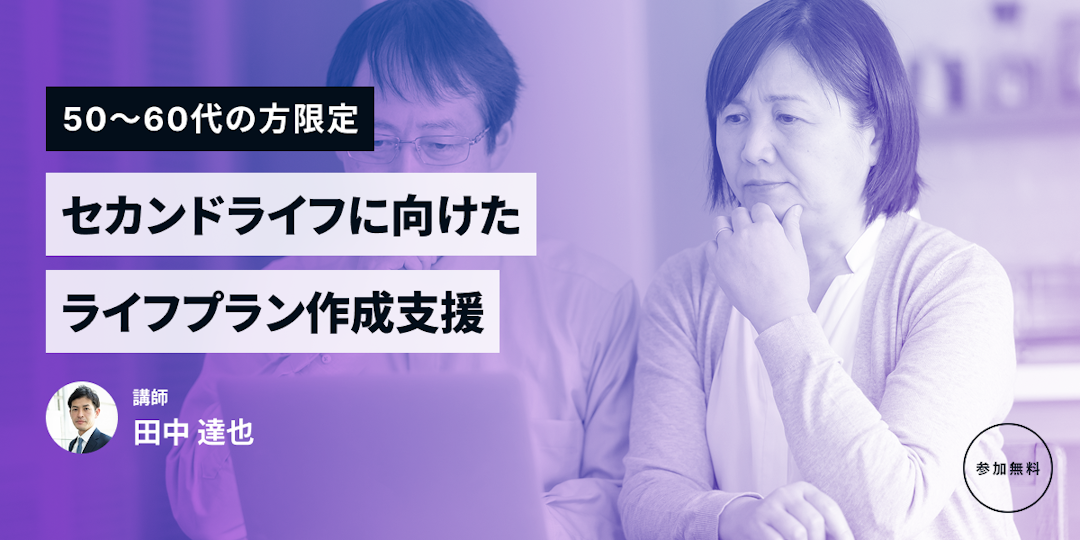 ・「自身の老後資金や年金について確認してみたい。」 ・「セカンドライフは趣味を楽しみたいけど資金が足りるか不安。」 ・「老後に向けてどんな資産運用が必要か。」 こんな想いをお持ちの方は、ぜひご参加ください! <個別相談ではこんなことがわかります> ・あなたのセカンドライフのライフプランシミュレーション作成 ・老後の資産運用における注意点 ・保険(保障)の見直し など このセミナーは、FP資格を持ち、多くの方のセカンドライフの相談を受けている講師が1on1の対話形式で進行いたします。 1on1だから、セミナー内容以外でもご不安なことやご不明なこともご相談いただけます。 どうぞご安心してお気軽にご参加ください。