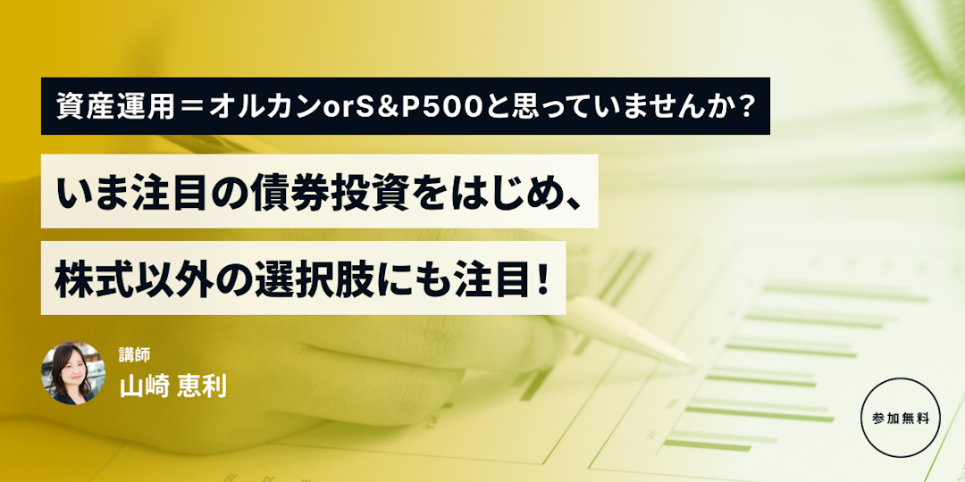 ・「資産運用が株式中心のままでいいか不安。」 ・「債券に興味があるけど、何から始めればいいかわからない。」 ・「今の資産構成のまま運用していいのか。」 こんな想いをお持ちの方は、ぜひご参加ください! <セミナーではこんなことがわかります> ・債券運用の基礎(メリット・デメリットなどを解説) ・今だからこそ債券を組み入れるべき理由 ・その他諸アセットクラスの概要とメリットデメリット ・現在運用中のポートフォリオの分析と改善提案 ・現在の米国と日本の金利状況 など このセミナーは、資産運用(特に債券運用、ポートフォリオ運用)に詳しい講師が1on1の対話形式で進行いたします。 2025年10月に米国株式が最高値を更新し、運用資産のバランスがこのままでいいのかご不安な方も多いのではないでしょうか? そこで今、注目されているのが外国債券という選択肢です。 2025年11月現在、米国の10年国債利回りは過去10年で相対的に高い水準にあるため、債券投資を始める良い機会です。 また、債券だけではなくゴールドや不動産等、多様な投資対象についてご案内させていただきます。 株式以外の選択肢を知り、皆様のポートフォリオをより良いものにするヒントを得ていただけたら幸いです。 1on1なので、セミナー内容以外でもご不安なことやご不明なこともご相談いただけます。 どうぞご安心してお気軽にご参加ください。