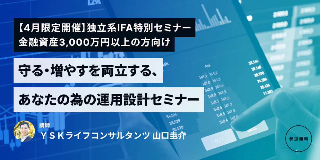 資産が3,000万円を超えてくると、単に「何を買うか」よりも、「資産全体をどう配分するか」が重要になります。本セミナーでは、現預金をどこまで持つべきか、円資産に偏りすぎていないか、株式・債券・保険をどう位置付けるべきかなど、“守る”と“増やす”を両立するための考え方を整理します。独立系IFAの立場から、まとまった資産をどう管理し、どう次の一手を考えるべきかを実践的にお話しします。本格的に資産運用を設計したい方に向けた内容です。